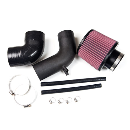3" high flow inlet pipe kit for upgraded turbos (with 3" inlet) on Hyundai Genesis Coupe 2.0T (2010 to 2012 model years). Wrinkle black powder coat with turbo grade multi-ply silicone hoses and clamps. Choose silicone color (Black, Red, or Blue). Includes silicone hoses to crankcase breather and high flow 3" filter.