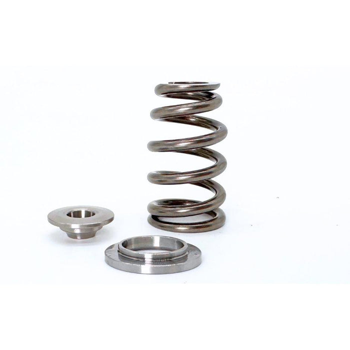 Ford Gen 1&2 5.0L Coyote V8 Beehive Spring & Titanium Retainer Set. Made from ultra clean Silicon Chrome spring steel with a higher fatigue resistance compared to other spring steels. Heat treating and post processing is the highest quality available. High frequency spring design to reduce spring surge at high operating RPM. 90lb seat pressure at 37.8mm installed height / 254lb at 15mm valve lift / max lift 15.9mm Install seat on top of OEM stem seal.
