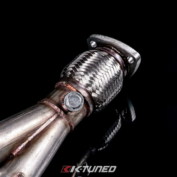 The K-Tuned Race Header offers a proven 4-1 design with a true slip-fit merge collector for maximum exhaust flow. The Race header is designed to deliver power gains in the upper RPM range, making it perfect for drag racing and street use. Like our other headers, it fits perfectly under shifter mounting kits and is well centered in the exhaust tunnel. The flex-pipe absorbs engine movement, and the optional flange allows installation to existing exhaust piping with minimal modification. Please note that all of our headers will require some exhaust welding for installation.
