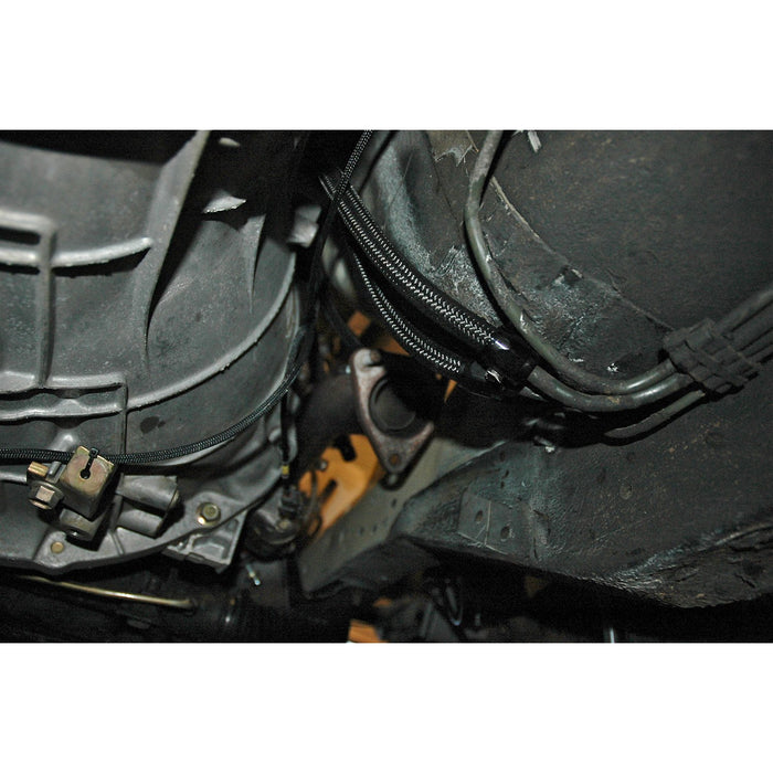 This deletes a portion of the engine bay feed and return hard lines and replaces the filter. In factory form its ugly, bulky, and routed inefficiently. You will cut the feed and return hard lines back about 12" inches and route toward the trans, along the firewall, then to the shock tower where the FPR will be mounted. In stock form it would be very close to the header so we must go the longer scenic route. See photo below for visual reference. This creates a nice tidy look that will allow for easy install / uninstall and can be a safe distance from its neighbor, the exhaust.