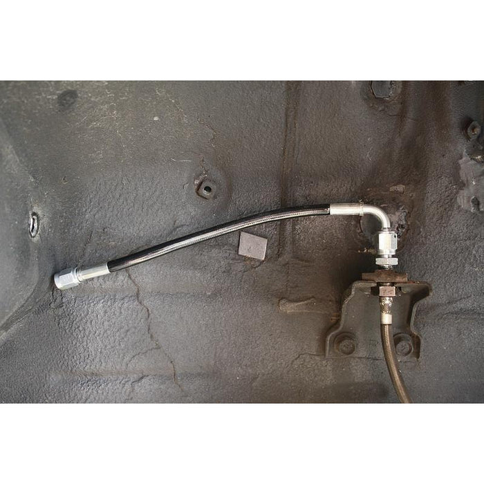 The OEM brake hard lines are relocated and replaced and with -3AN stainless steel braided, Teflon PTFE lined, black PVC coated lines. We use the best components in the industry and we pressure test every line we assemble. We guarantee a leak free start up if this product is installed correctly. CLICK HERE if you need the OE Master Cylinder Brake Line Relocation Kit.