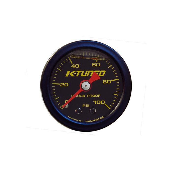 K-Tuned Fuel Pressure Gauges are liquid filled to prevents failure due to the vibration and constant movement of the engine. The liquid-filled (shock proof) design ensures the needle remains steady while the engine is running. Cheaper and less accurate fuel gauges are easily spotted because the needle tends to bounce around making them difficult to read. Our quality gauge accurately reads pressure between 0-100 psi. It is finished in all black with yellow lettering/numbers, red needle and our K-Tuned logo on the bezel.