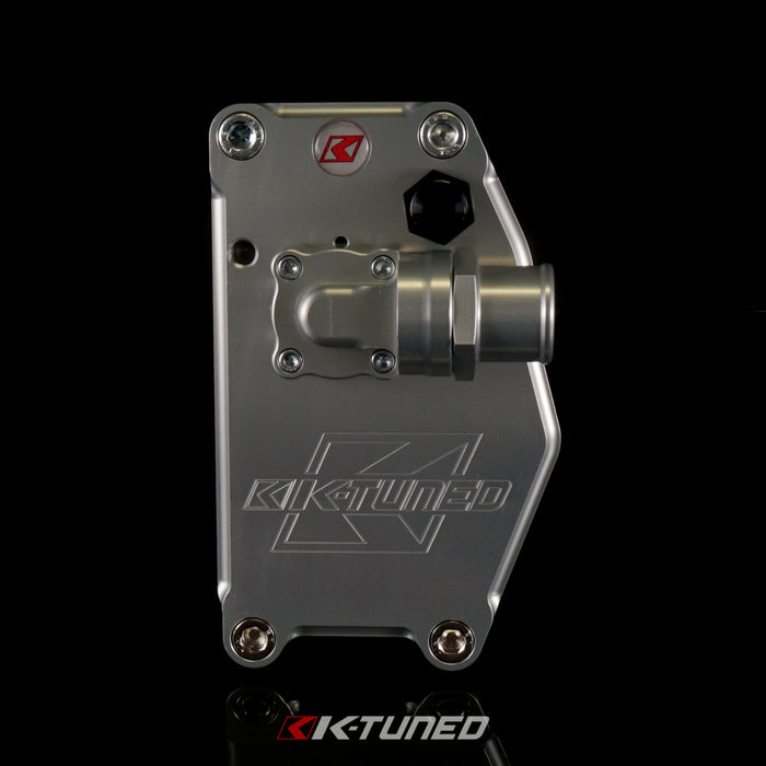 For several years now racers have used electric water pumps to reduce the power robbing effects of parasitic drag from their engines. By reducing the number of accessories the crank needs to turn there can be some impressive gains. The K-Tuned Water Pump Block Off Plate system was designed to setup a K-series engine to run an electric water pump cooling system. It replaces all the bulky and heavy OEM accessories with a simple lightweight aluminum plate. The kit is designed to allow the perfect flow of coolant and also effectively release unwanted crankcase pressure. The water port is sealed just like it was from the factory using an o-ring seal. The breather port is threaded for an 8AN fitting and can easily be routed to any catch can set-up.