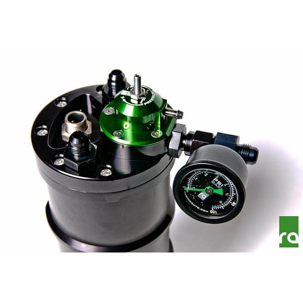 The FST-R (Fuel Surge Tank–Regulated) is an all-new design that houses a single internal fuel pump and has an integrated fuel pressure regulator machined into the top cap. The high-flow regulator is adjustable and features interchangeable orifice sizes. This revolutionary idea eliminates the need for an external fuel pressure regulator along with the extra fittings and hoses. This simplifies the installation, reduces overall cost, reduces weight, and eliminates potential leak points in the fuel system. Furthermore, this system permits cooler fuel temperatures as the fuel is not returning from the hot engine bay. Like all Radium fuel surge tanks, this universal product can be used on any fuel injected application and is compatible with all fuel types. Additional details on the design of the FST-R can be found here.