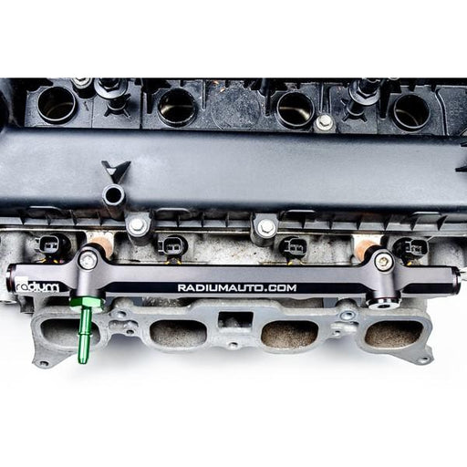 This Radium Engineering fuel rail is CNC machined from extruded 6063 aluminum, black anodized, and laser etched for a high quality surface finish.